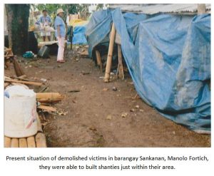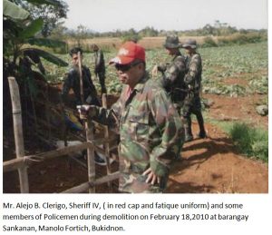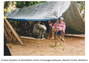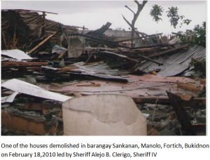 In the early morning of February 18, 2010, Sheriff Alejo Clerigo accompanied by members of the Police Provincial Mobile Group and a demolition team, or approximately one hundred persons commanded the demolition of the houses and properties of 137 villagers (28 families) living in Sankanan village of Bukidnon.